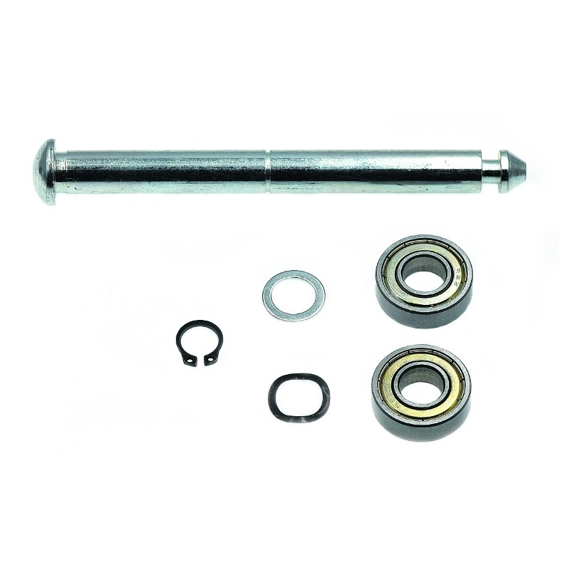 Axe en acier galvanisé avec 2 roulements, 1 circlips et 2 rondelles permettant le pour maintien des roues sur remorque vélo enfants de la marque ATOO.