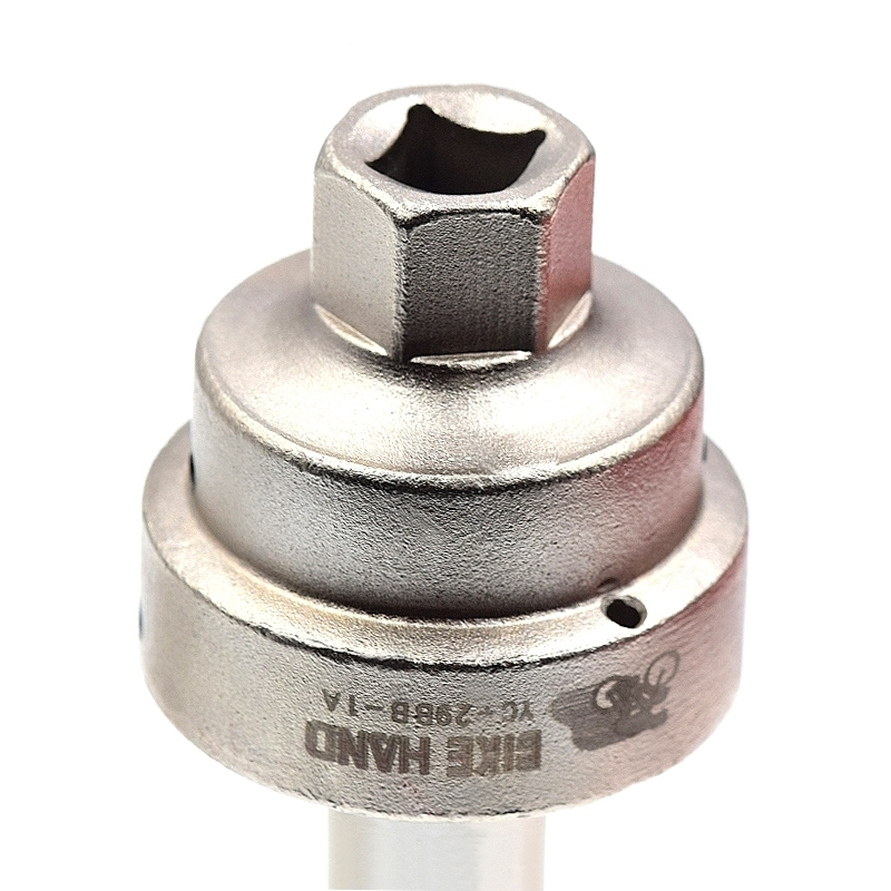 Outil en aluminium forgé permettant le montage des cuvettes et roulements externes pour vélo. L’outil offre un bon couple de serrage et un emboitement avec un alignement parfait des cuvettes et roulements lors de leurs montage